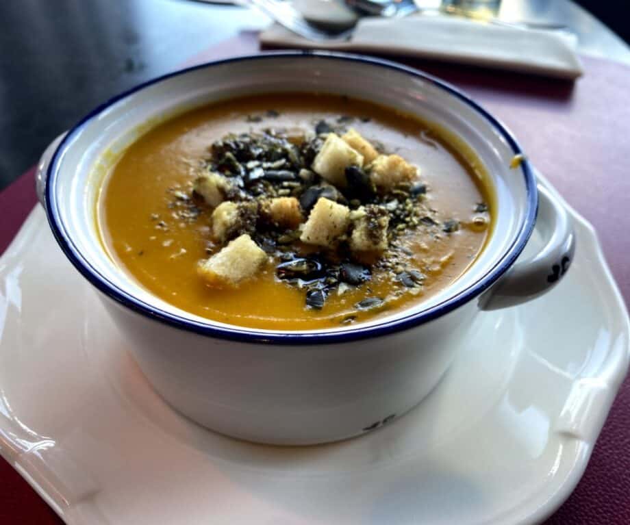 We didn’t have so long before catching our bus back to Innsbruck so each just chose one dish from a menu of soups and mains. The comforting bowl of cream of pumpkin soup was generously laced with coconut milk and scattered with crisp croutons. The subtle sweetness of the coconut complements the earthy pumpkin, and it’s satisfyingly warming after our outdoor excursions.