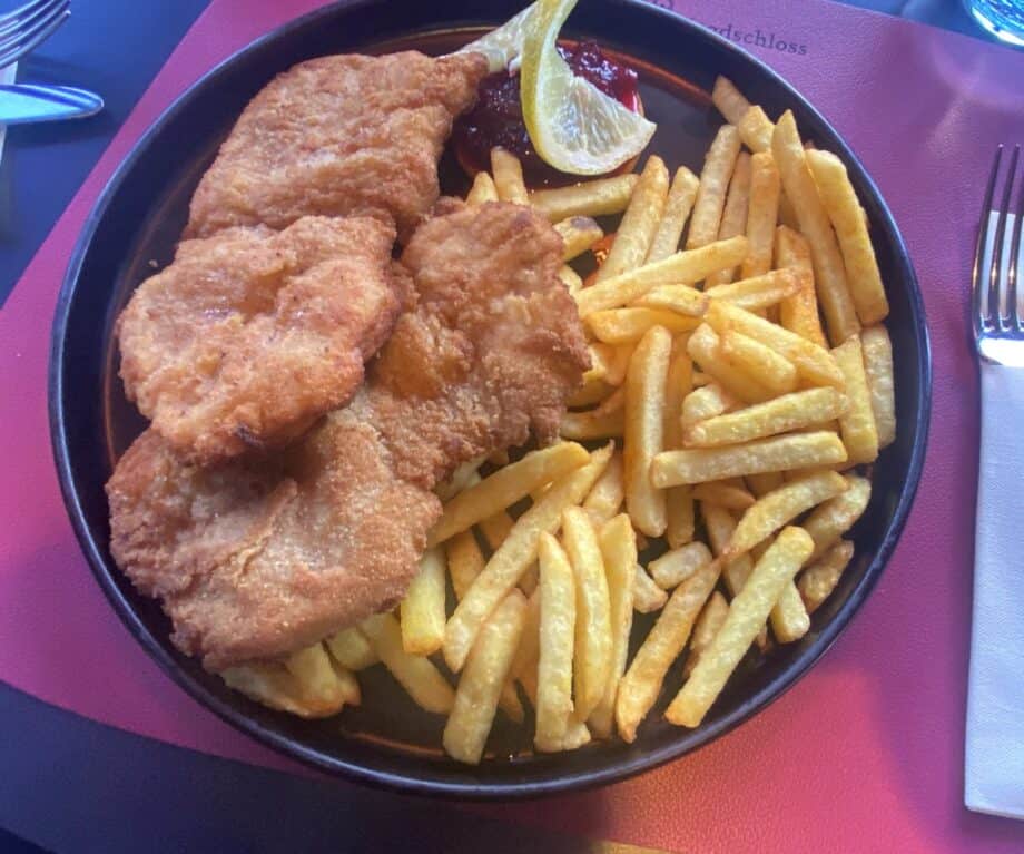 I chose the wiener schnitzel, a delicious golden veal dish served with chips and cranberry sauce – a timeless dish and the epitome of Austrian tradition.