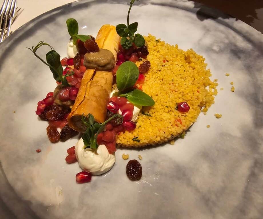 Eggplant cream baked in filo pastry with Mediterranean couscous salad, pomegranate seeds, raisins & homemade labneh