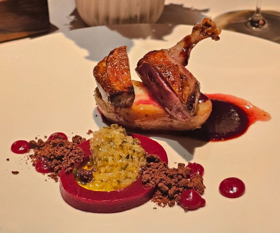 Roasted breast of pigeon with la ratte potatoes, raspberry gel, tarragon vinaigrette, dark chocolate & raspberry jus